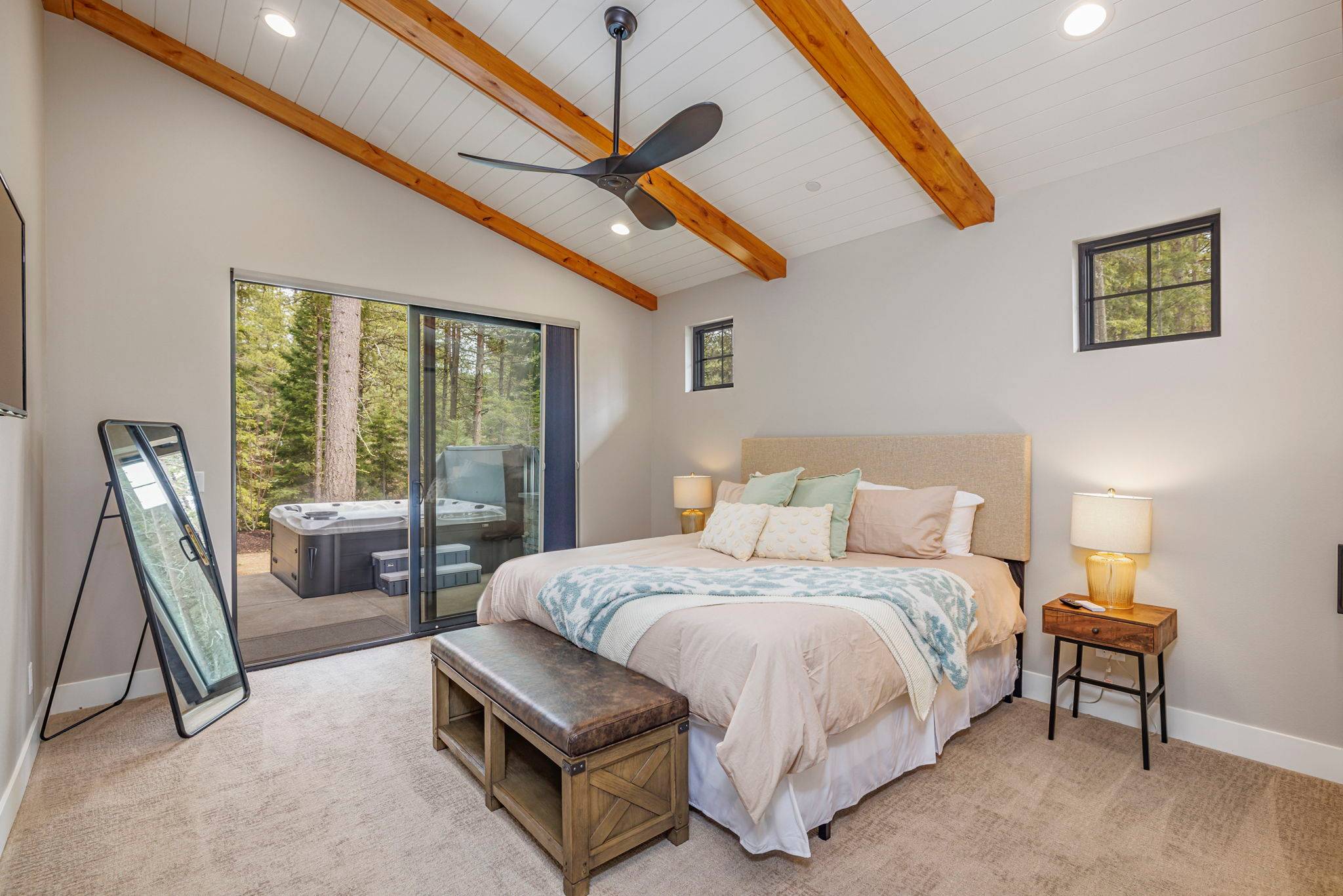 Outdoor living was a key focus of this build, with a covered patio, integrated overhead heaters, built-in grill, hot tub, and a gas fire pit creating year-round functionality and comfort. The expansive lawn offers room to relax, play, or take in the surrounding views.