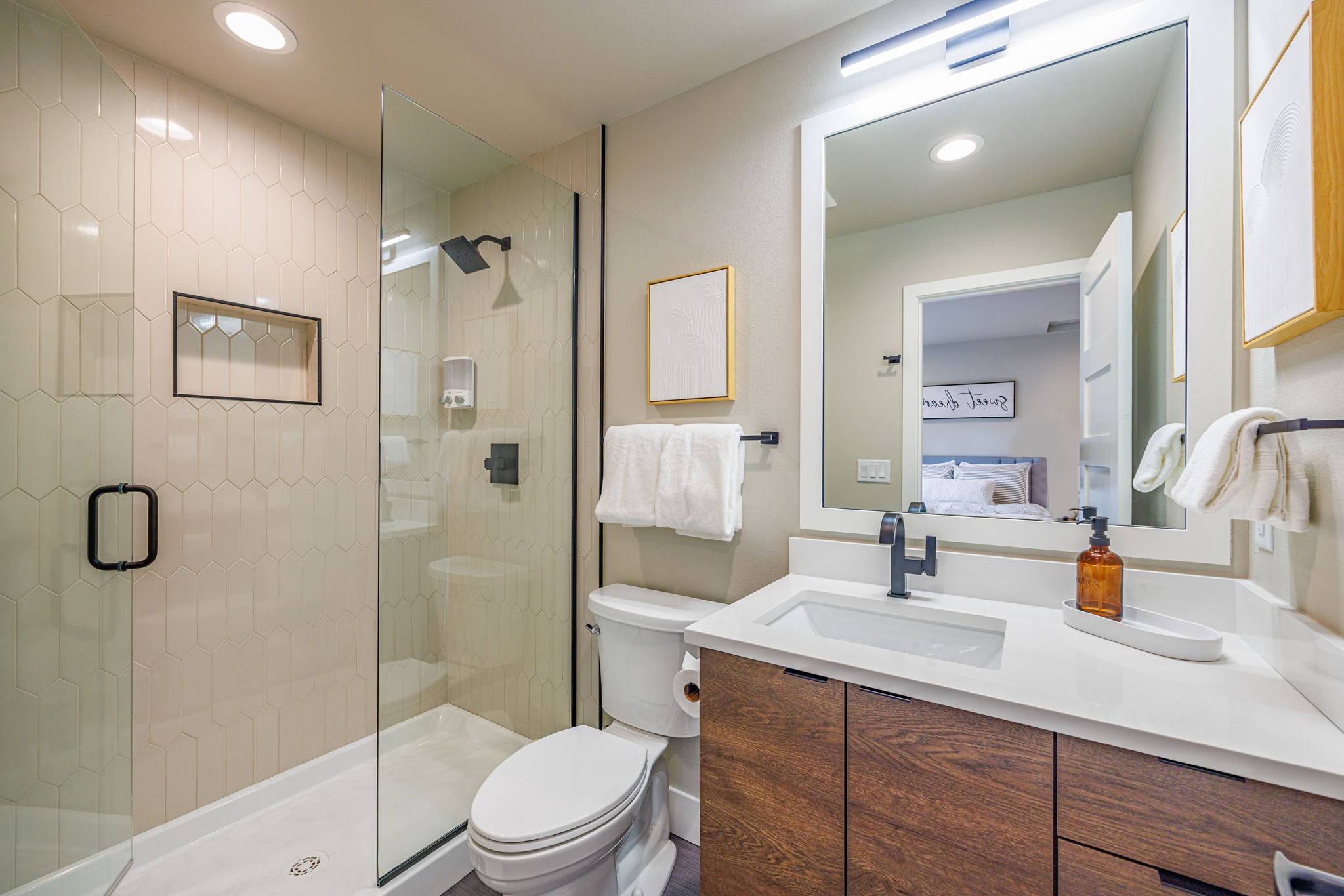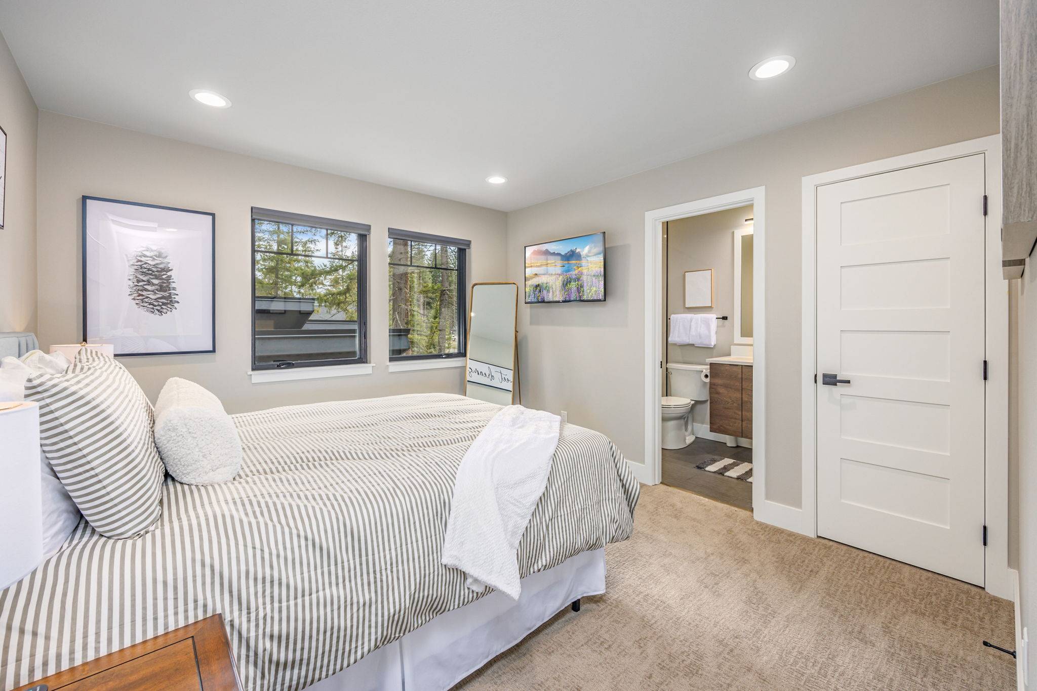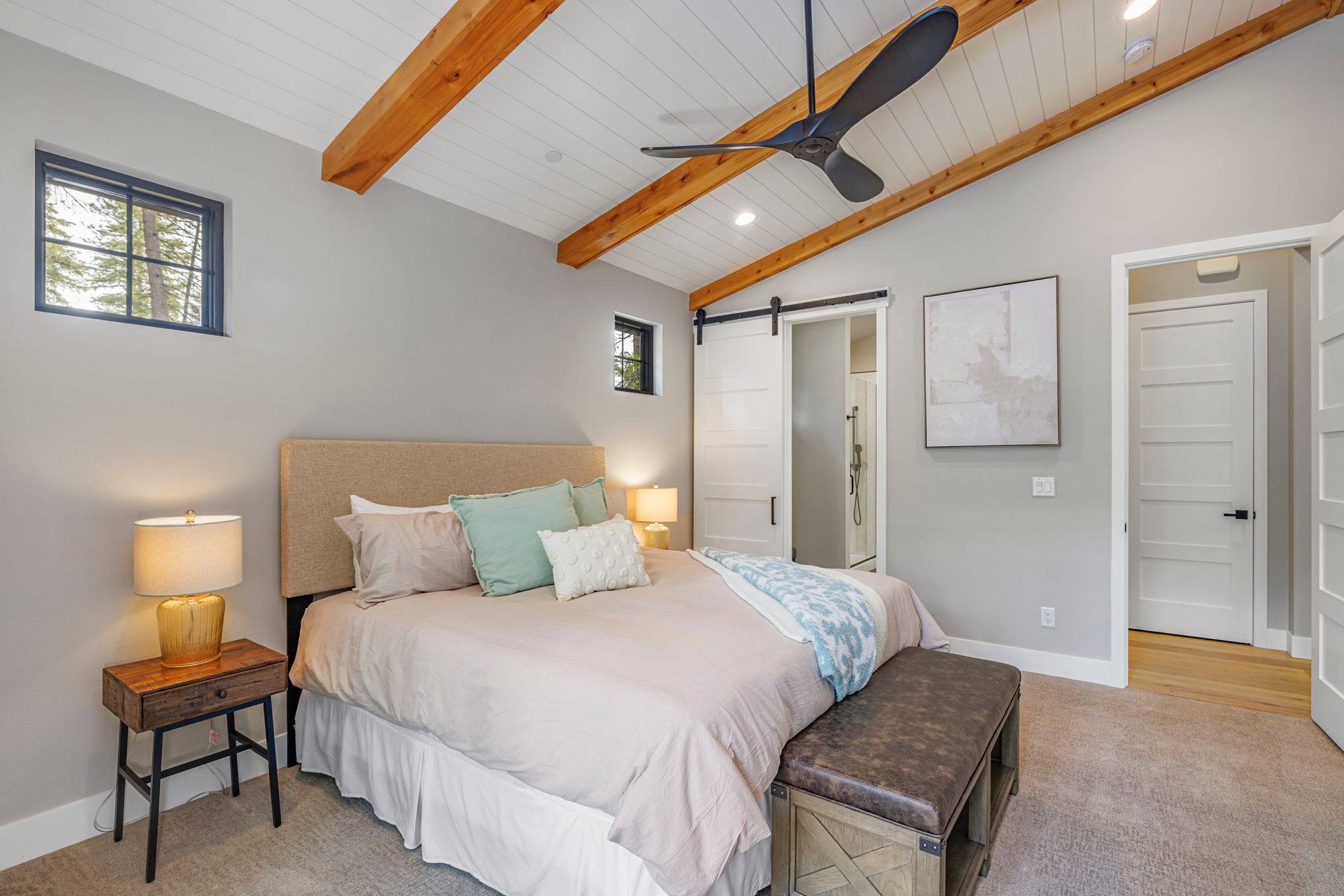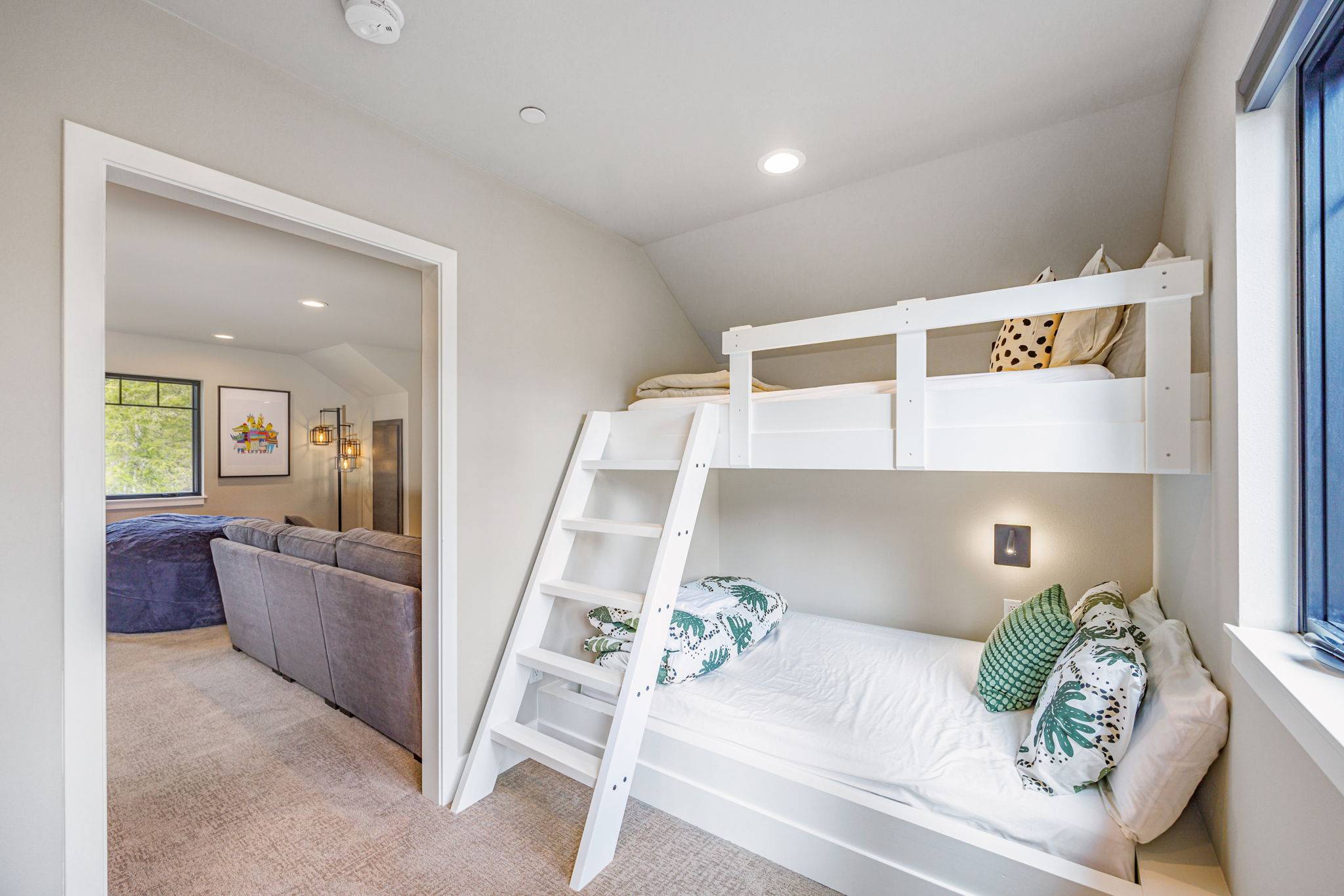 The kitchen is thoughtfully designed for both form and function, featuring custom cabinetry, a large center island with seating, and generous workspace for everyday living or entertaining. The three primary suites offer private retreats with en-suite bathrooms and premium finishes, while the additional bedrooms—including two bunk rooms—provide flexible accommodations for family or guests.